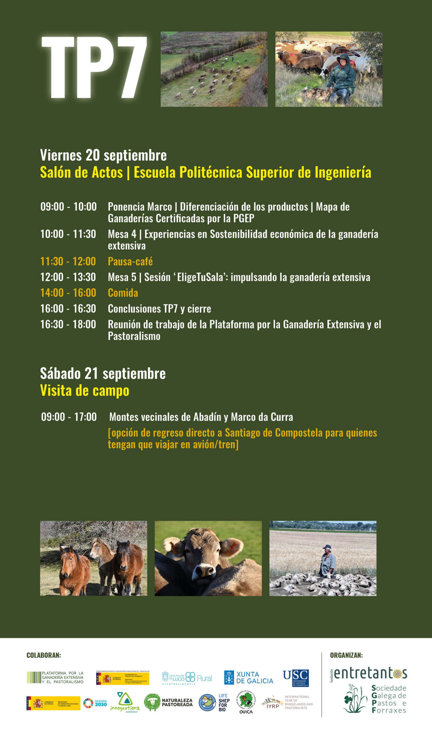 Se van perfilando los contenidos de los tres días del programa de Territorios Pastoreados 7 que tendrá lugar en Lugo los días del 18 al 21 de septiembre, organizado por la Fundación Entretantos y la Sociedad Galega de Pastos e Forraxe y en el que colaboramos un buen grupo de entidades (ver cartel).